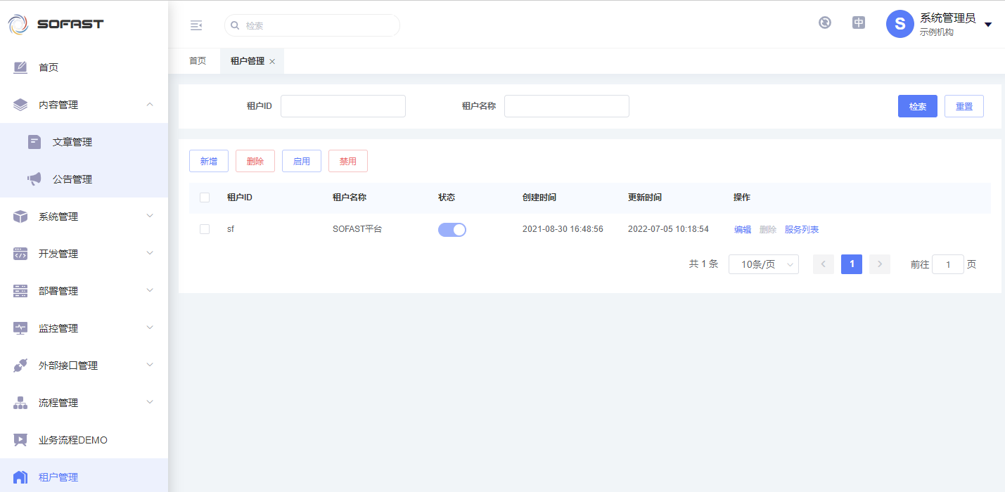 租户ID不可编辑 创建租户之后,会自动根据配置文件中的服务信息创建租户服务数据