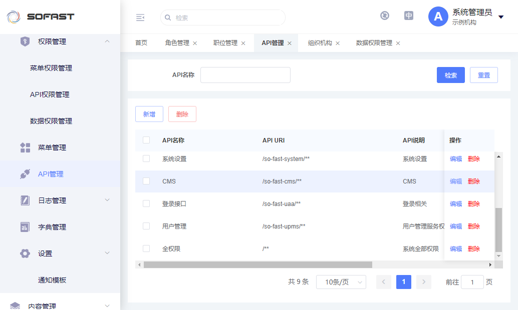 API管具备新增、删除、编辑、启用、禁用、根据API名称来检索数据的功能。