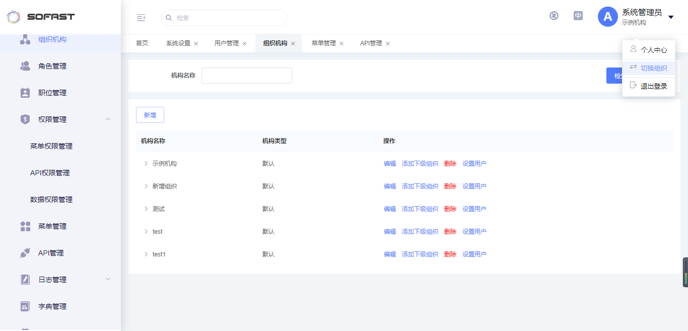 组织机构具备新增,删除,编辑,添加下级组织,设置用户,根据机构名称来检索数据的功能。