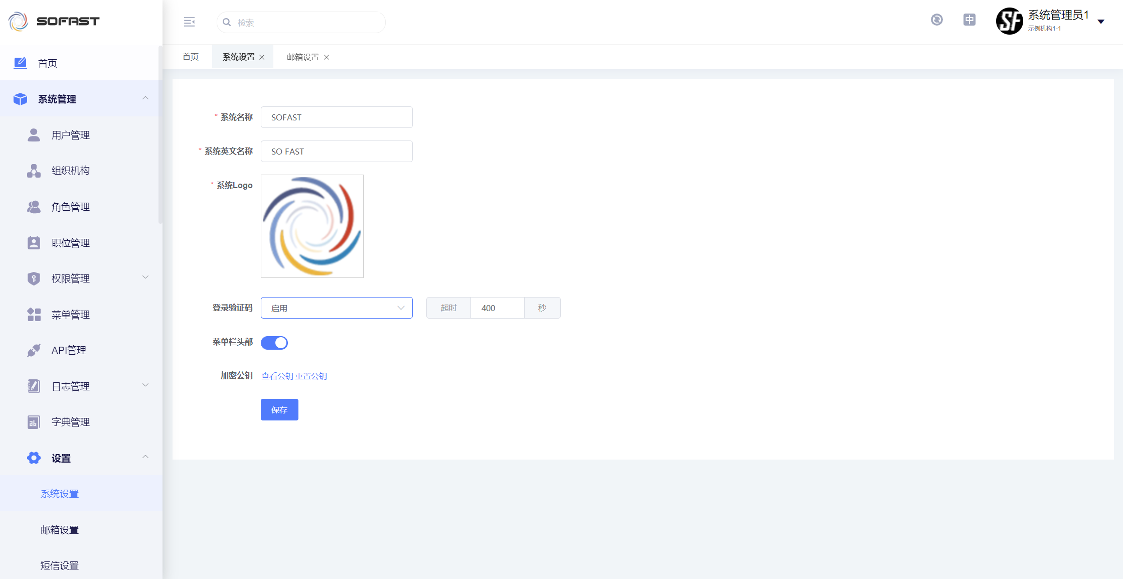 设置系统名称、系统英文名称、系统Logo、 是否开启登录使用验证码、是否在菜单栏头部展示名称和Logo、加密公钥(用于登录时密码字段加解密)。
