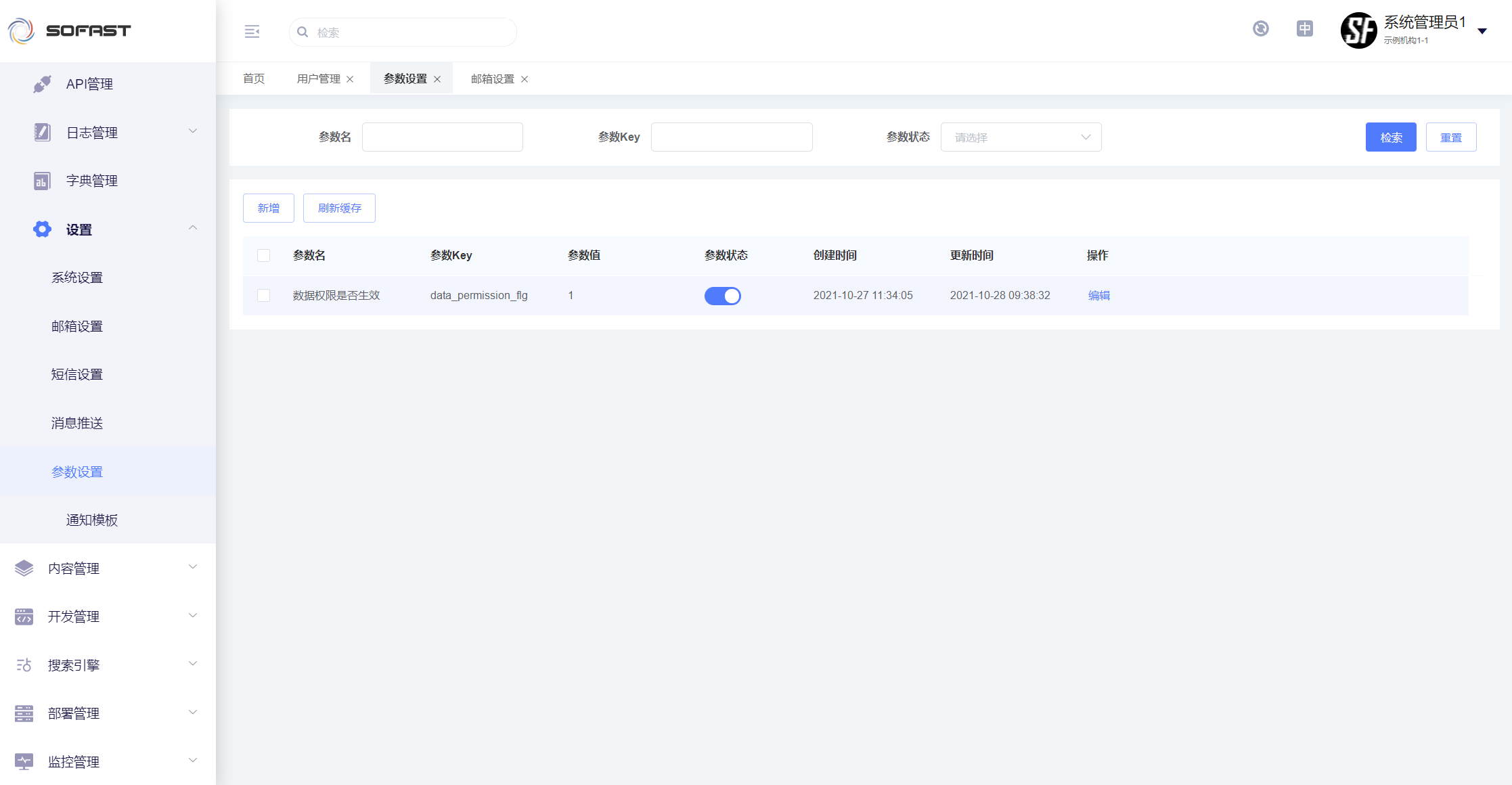 参数设置是提供给开发人员、运维人员的动态参数配置的功能,创建或修改参数后,点击刷新缓存按钮。