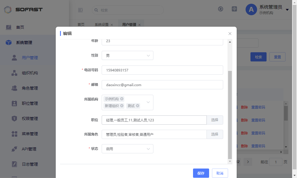 可以通过新增或编辑对用户绑定组织机构、角色、职位信息和基础信息。