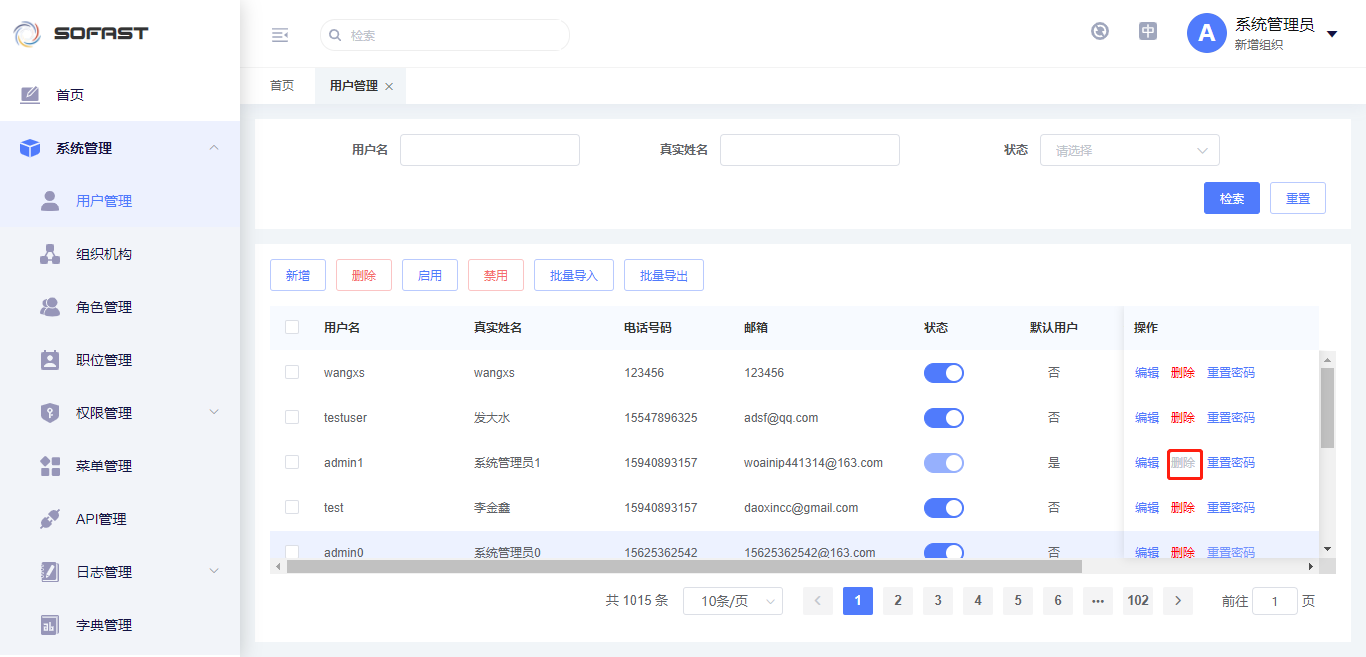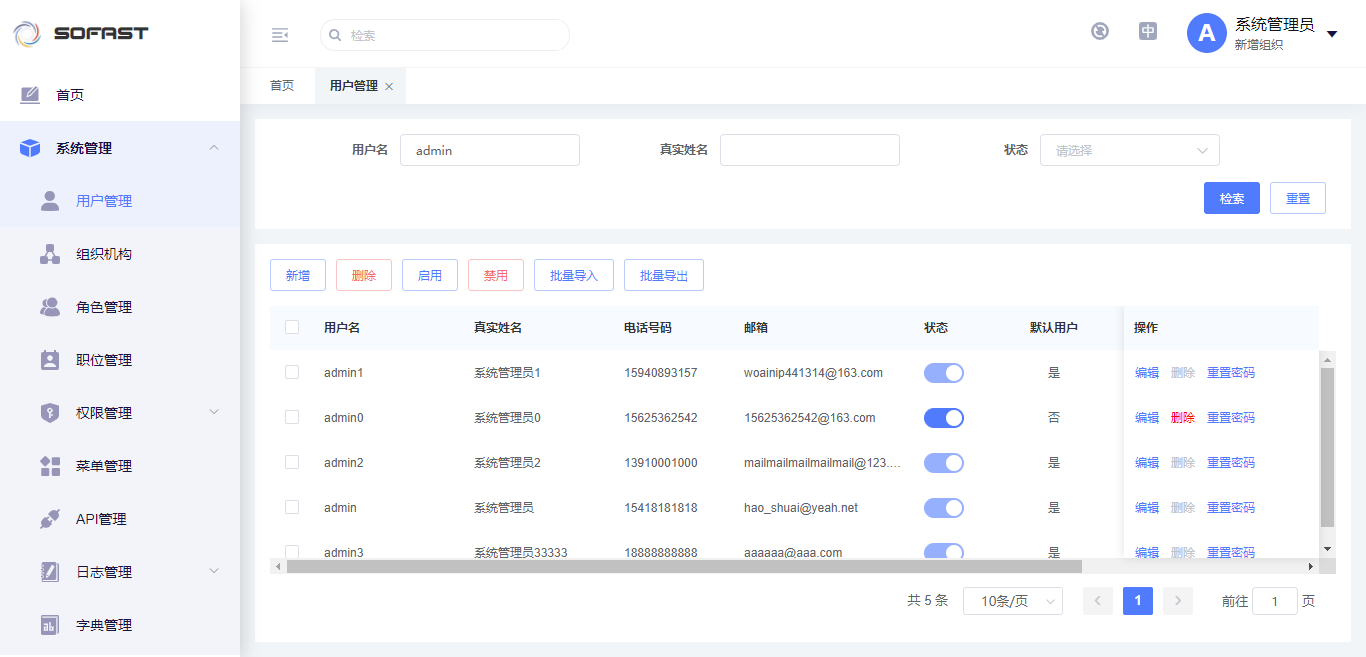 用户管理具备新增、删除、启用、禁用、批量导入、批量导出、编辑、重置密码和根据条件(用户名,真实姓名,状态)检索数据的功能。